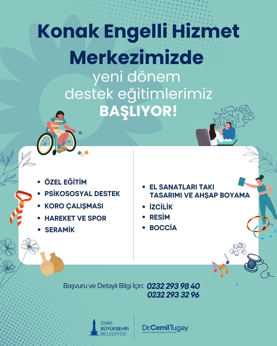 Konak Engelli Hizmet Merkezi’nde ise özel eğitim, psiko sosyal destek, koro çalışması, spor, seramik, el sanatları, takı tasarımı ve ahşap boyama, izcilik, boccia ve resim hizmetleri sağlanıyor. Merkeze kayıt yaptırmak isteyen yurttaşlar, 0232 293 98 40 ve 0232 293 32 96 numaralı telefonu arayarak başvuruda bulunabiliyor.