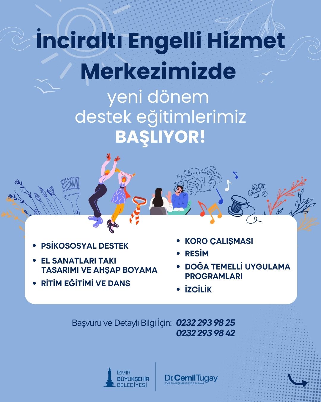 İnciraltı Engelli Hizmet Merkezi’nde psiko sosyal destek, el sanatları, takı tasarımı ve ahşap boyama, ritim eğitimi ve dans, koro çalışması, resim, doğa temelli uygulama programları ve izcilik hizmeti sunuluyor. Merkeze kayıt yaptırmak isteyen yurttaşlar, 0232 293 98 25 ve 0232 293 98 42 numaralı telefonu arayarak başvuruda bulunabiliyor.