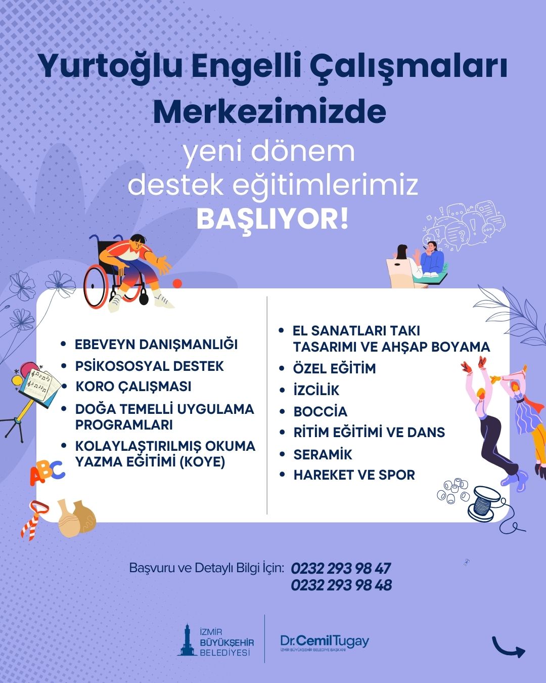 Yurtoğlu Engelli Hizmet Merkezi’nde ebeveyn danışmanlığı, psiko sosyal destek, koro çalışması, doğa temelli uygulama programları, kolaylaştırılmış okuma yazma eğitimi, el sanatları, takı tasarımı ve ahşap boyama, özel eğitim, izcilik, boccia, ritim eğitimi ve dans, seramik ile spor hizmetleri veriliyor. Merkeze kayıt yaptırmak isteyen yurttaşlar, 0232 293 98 47 ve 0232 293 98 48 numaralı telefonu arayarak başvuruda bulunabiliyor.